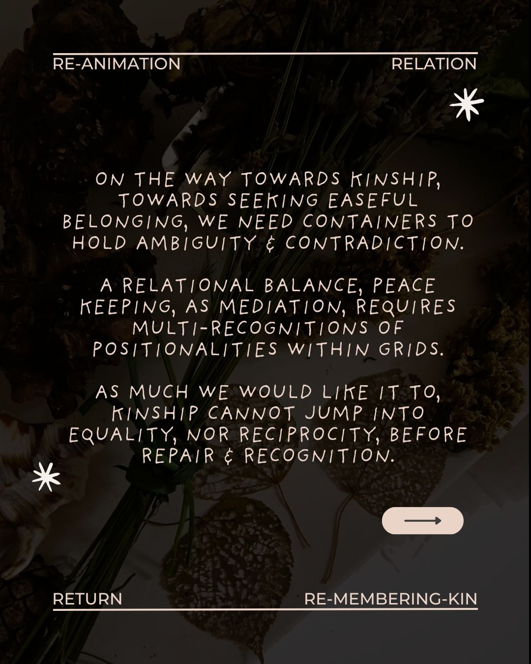 This practice offers strategy & support for our return into Kinship, which we discuss as a relational & multidimensional way of viewing, mapping & understanding our existence - as accessed through Contradiction.
